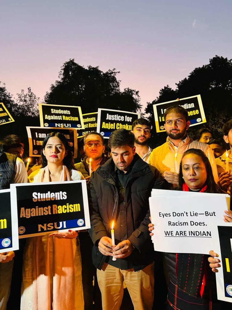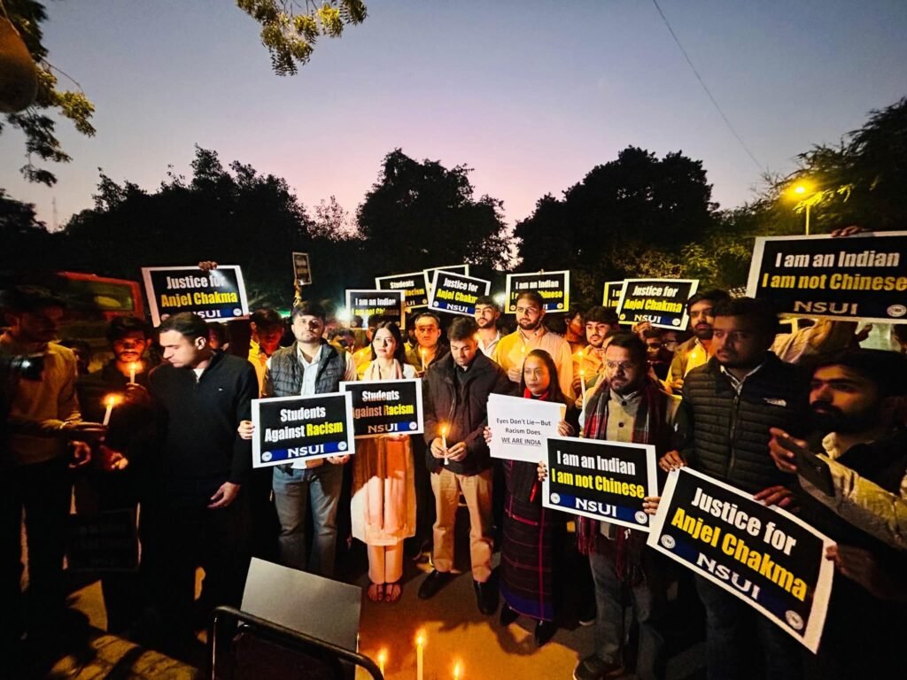 देहरादून में त्रिपुरा के छात्र एंजल चकमा की हत्या के बाद दिल्ली में एनएसयूआई ने कैंडल मार्च निकालकर विरोध जताया