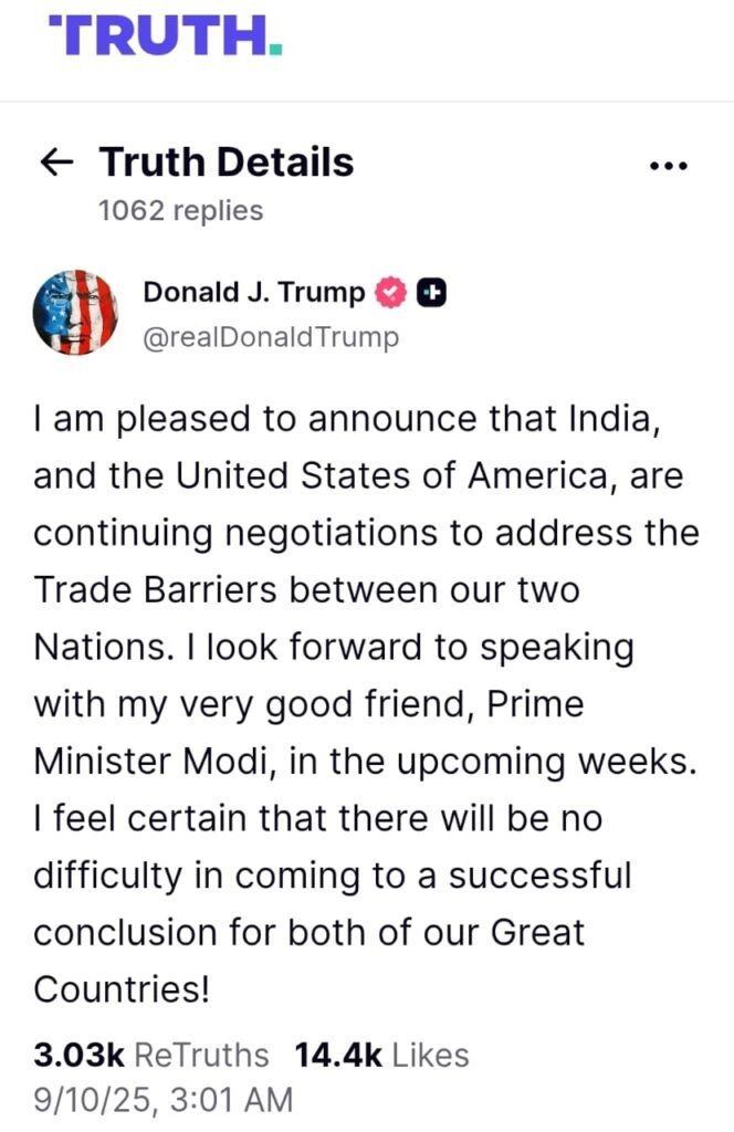 “भारत और अमेरिका अपने बीच मौजूद व्यापारिक अवरोधों को दूर करने के लिए बातचीत कर रहे हैं। आने वाले हफ्तों में मैं अपने बहुत अच्छे मित्र प्रधानमंत्री मोदी से बात करूंगा। मुझे विश्वास है कि दोनों महान देशों के लिए समझौते तक पहुंचना मुश्किल नहीं होगा।”